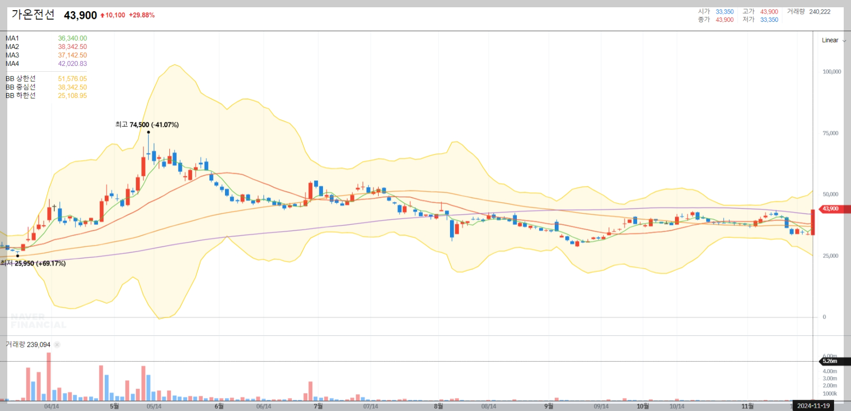 2024년 11월 19일 기준으로 가온전선의 주가는 43,900원으로 상한가를 기록하며 29.88% 상승했습니다. 최근 거래량도 급증하면서 투자자들의 관심이 높아지고 있습니다.