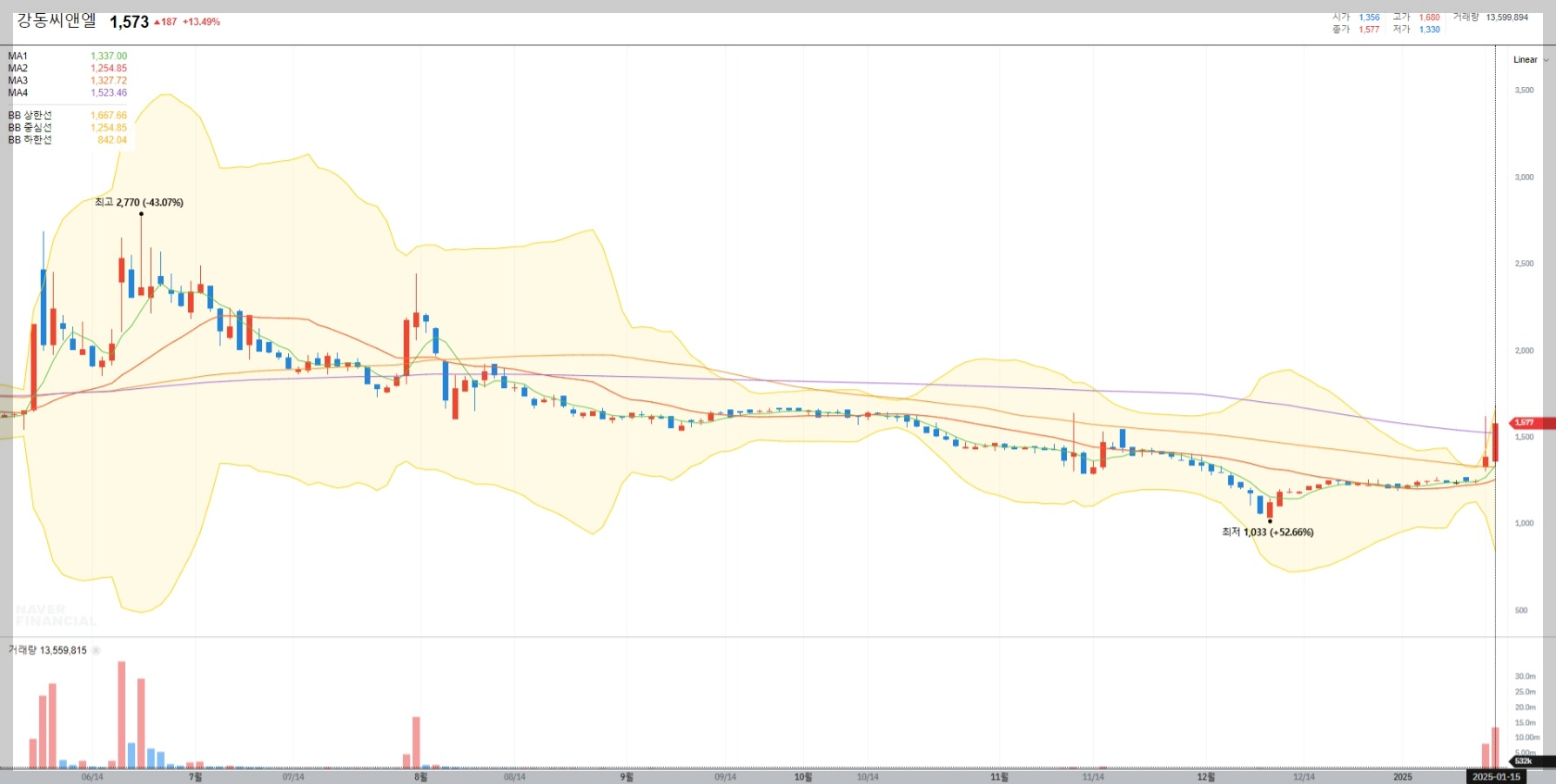 2025년 1월 15일 기준 강동씨앤엘의 주가는 1,573원으로 전일 대비 13.49% 상승했습니다. 최근 볼린저밴드 상단을 돌파하며 기술적 강세를 보이고 있습니다.