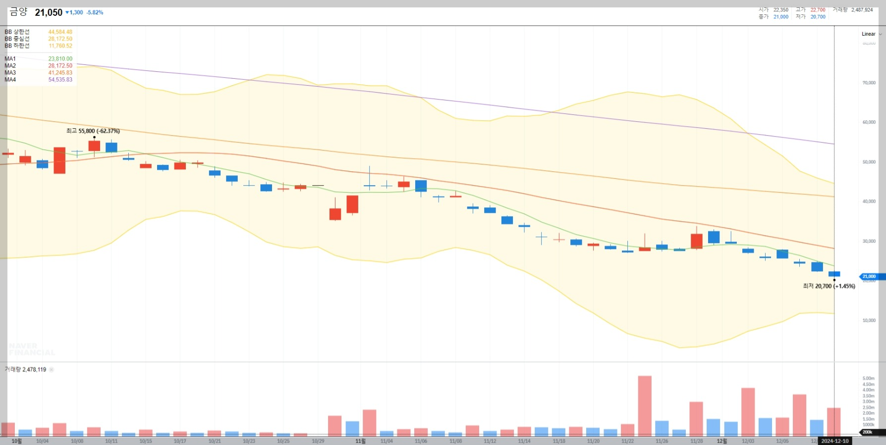 2024년 12월 현재 금양의 주가는 21,050원으로 최근 하락세를 보이고 있습니다. 이는 전반적인 시장 불확실성과 내부 경영 리스크에 기인한 것으로 보입니다.