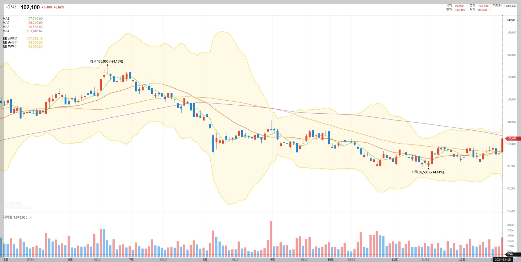 2024년 12월 18일 기준으로 기아의 현재 주가는 102,100원으로 전일 대비 6.69% 상승했습니다. 이는 최근 시장에서 긍정적인 투자 심리가 반영된 결과로 보입니다.