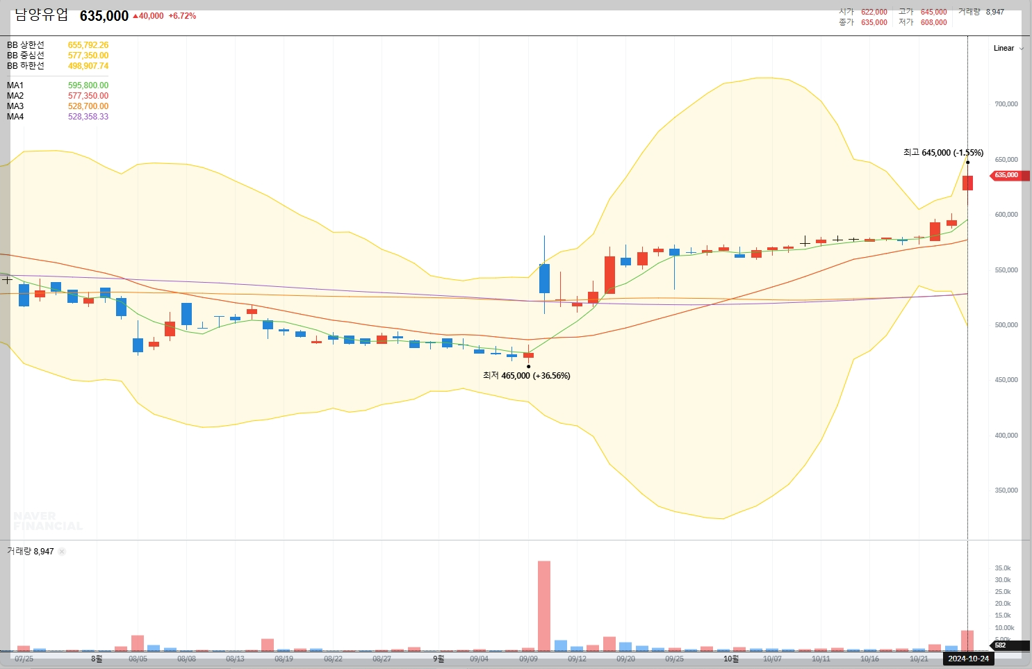 2024년 10월 24일 기준으로 남양유업의 주가는 635,000원이며, 전일 대비 6.72% 상승한 것으로 나타났습니다.