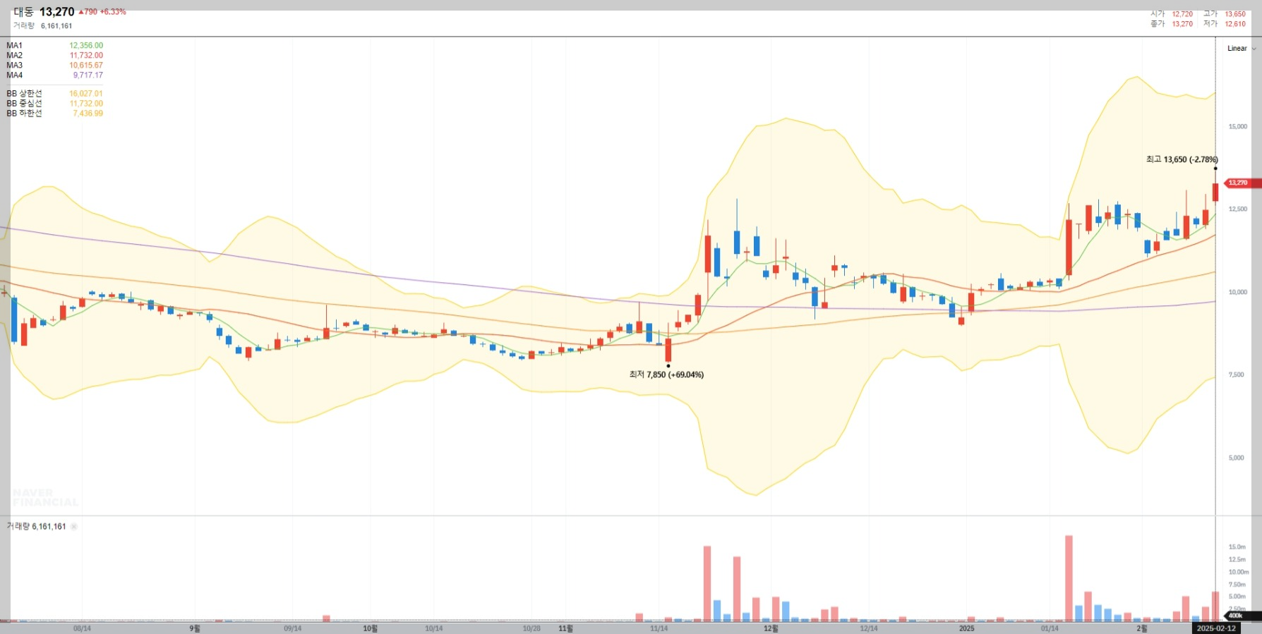 2025년 2월 13일 기준으로 대동의 현재 주가는 13,270원입니다. 이는 전일 대비 6.33% 상승한 수치로, 최근 거래량 증가와 함께 상승세를 보이고 있습니다. 이는 투자자들의 관심이 높아지고 있음을 시사합니다.