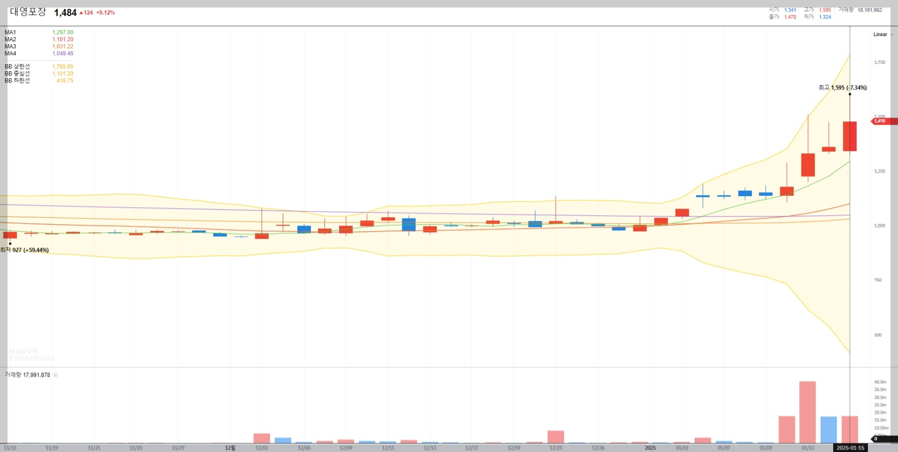 2025년 1월 15일 기준 대영포장의 주가는 1,484원으로 전일 대비 9.12% 상승했습니다. 이는 볼린저밴드 상단을 돌파하며 강한 상승세를 보여줍니다.