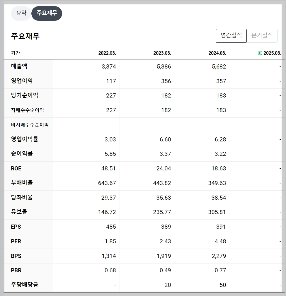 2023년 기준 동원금속의 매출액은 5,386억 원으로 전년 대비 증가했으며, 영업이익도 개선되었습니다. 부채비율은 443.82%로 안정화되었습니다.