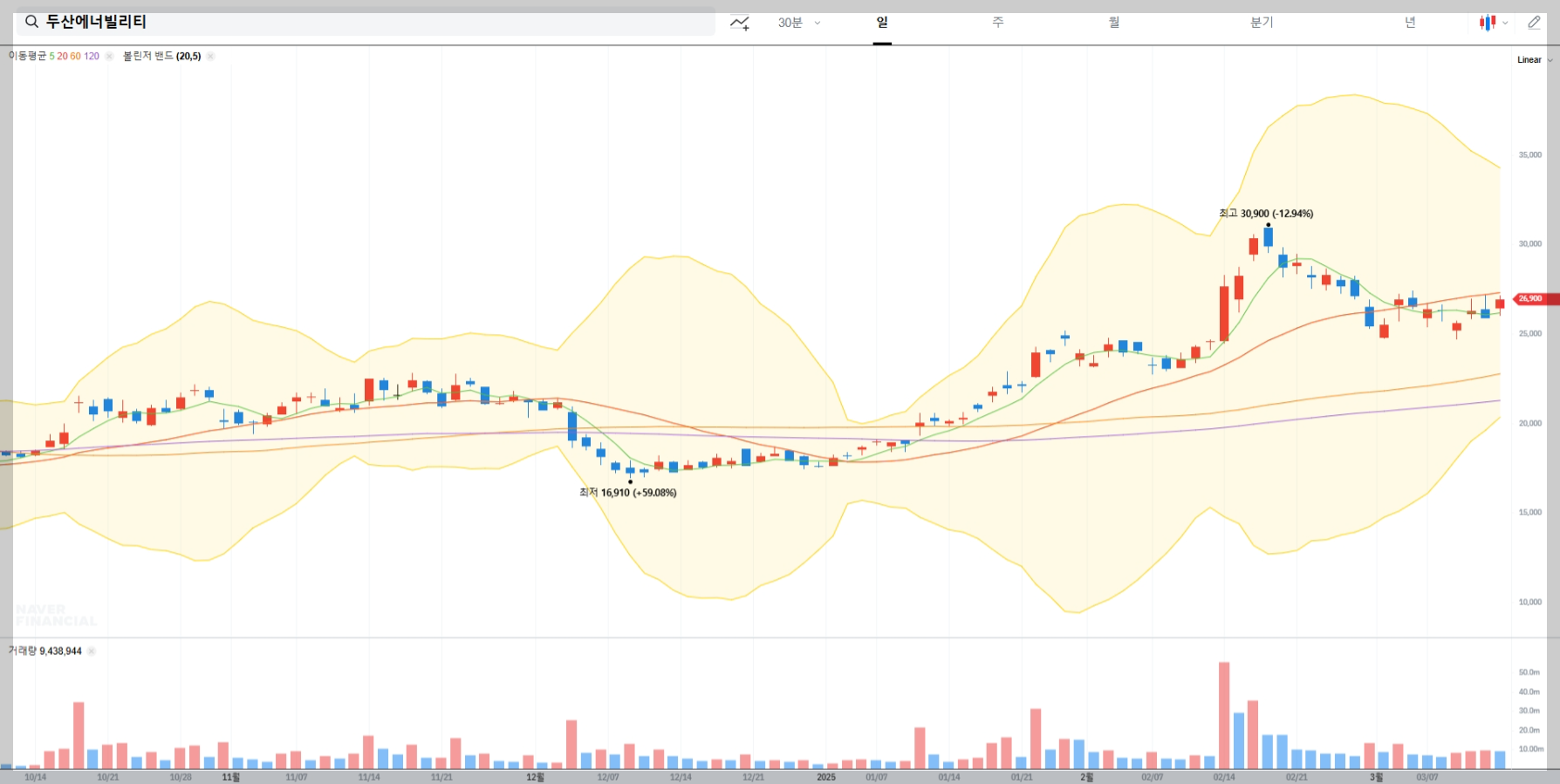 볼린저밴드를 활용한 매매기법은 현재 두산에너빌리티의 변동성이 높은 상태에서 유효합니다. 상단 밴드 돌파 시 매도 신호를 고려하고 하단 밴드 접근 시 매수 기회를 탐색할 수 있습니다.