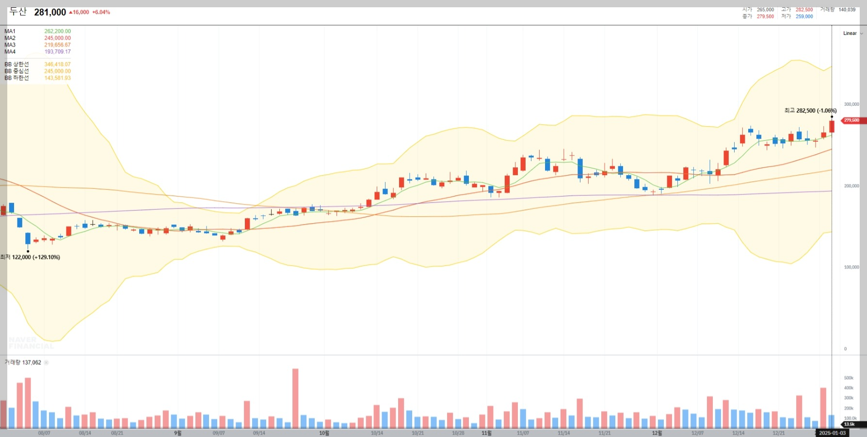 2025년 1월 3일 기준으로 두산의 주가는 281,000원으로 전 거래일 대비 6.04% 상승했습니다. 이는 시장에서 긍정적인 투자 심리를 반영한 결과로 보입니다. 최근 몇 달 동안 꾸준한 상승세를 기록하며 투자자들의 관심을 끌고 있습니다.