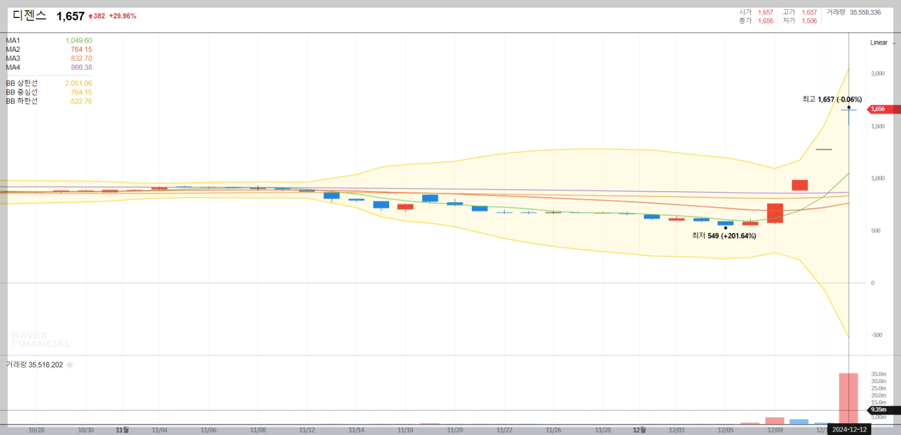 볼린저밴드는 디젠스의 변동성을 측정하는 데 유용한 도구입니다. 현재 디젠스의 주가는 볼린저밴드 하단 근처에 위치해 있으며, 이는 매수 기회로 간주될 수 있습니다. 상단에 도달하면 매도 전략을 고려할 수 있습니다.