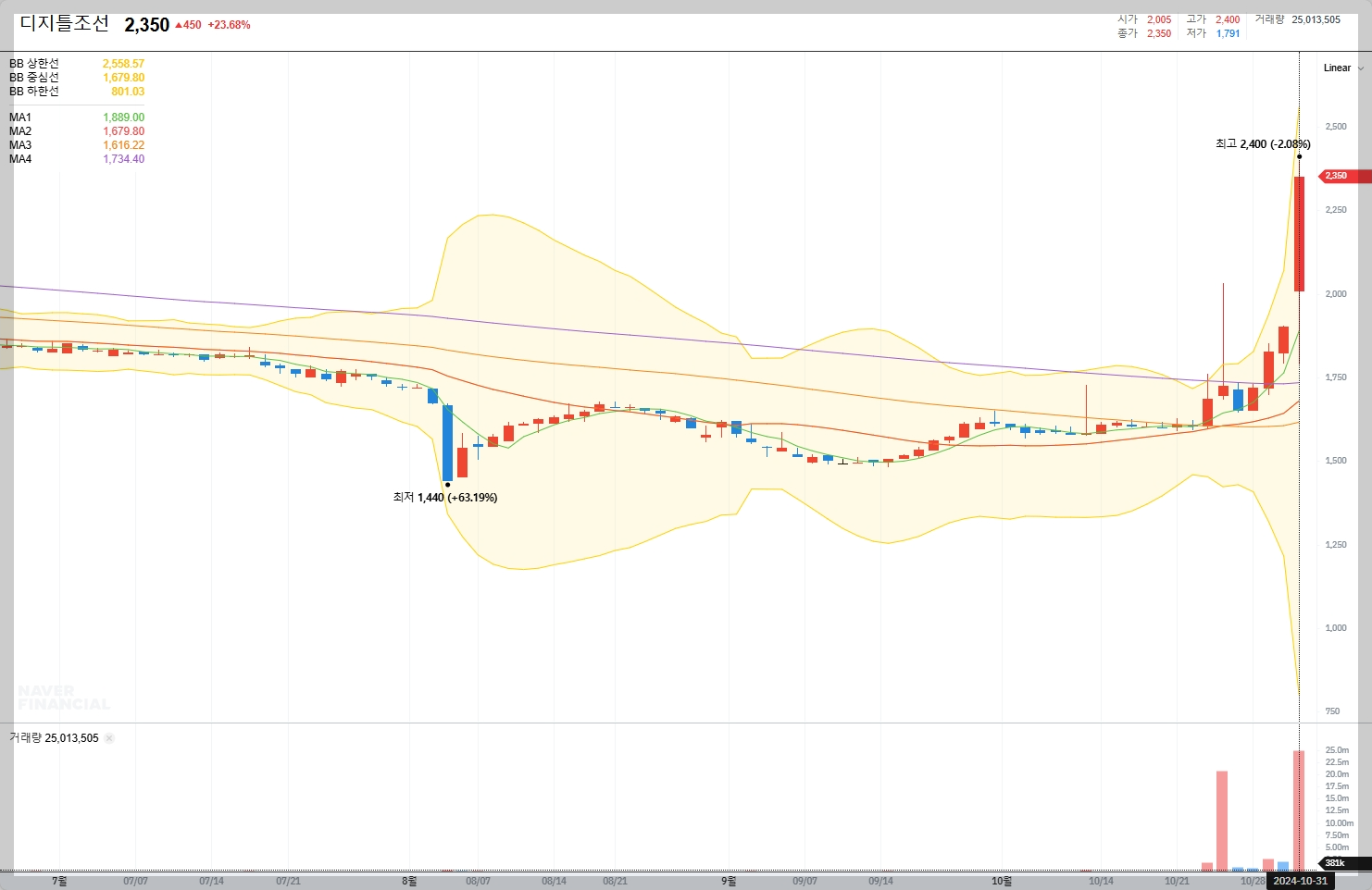2024년 10월 31일 현재, 디지틀조선의 주가는 2,350원이며, 이는 52주 최고가인 2,535원에서 하락한 수치로, 52주 최저가인 1,440원에 근접해 있습니다.