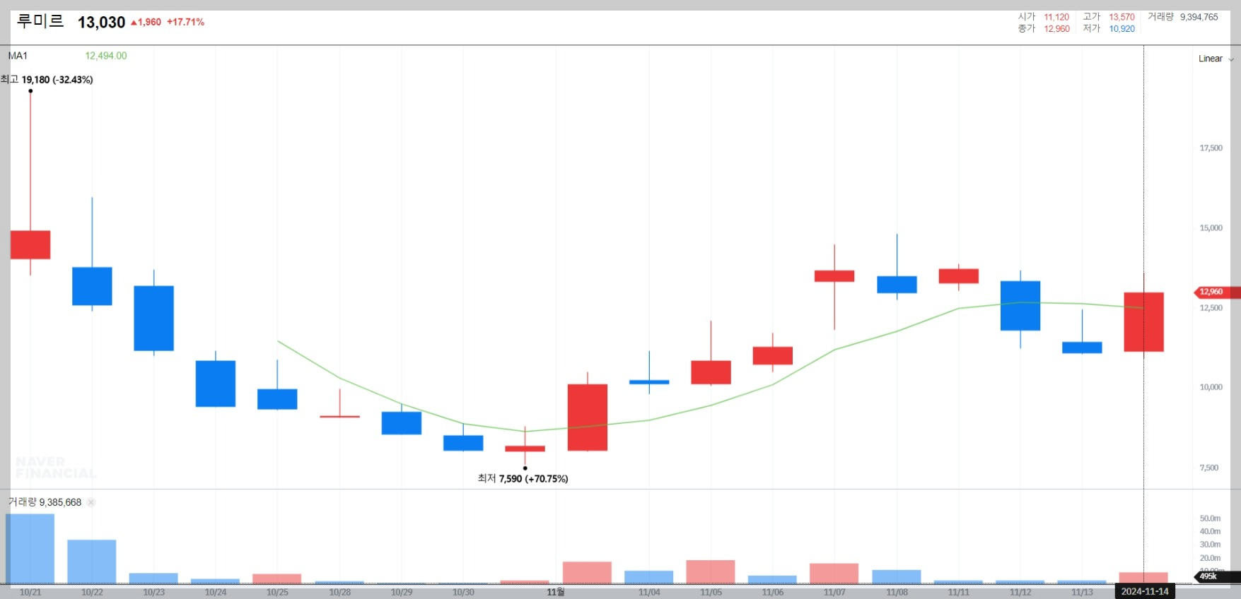 2024년 11월 14일 기준으로 루미르의 주가는 13,030원으로 전일 대비 17.71% 상승했습니다. 이는 최근 몇 달간의 하락세 이후 큰 반등을 보여준 것입니다. 최저가는 7,590원에서 기록되었으며, 최고가는 19,180원으로 변동성이 큰 모습을 보였습니다.