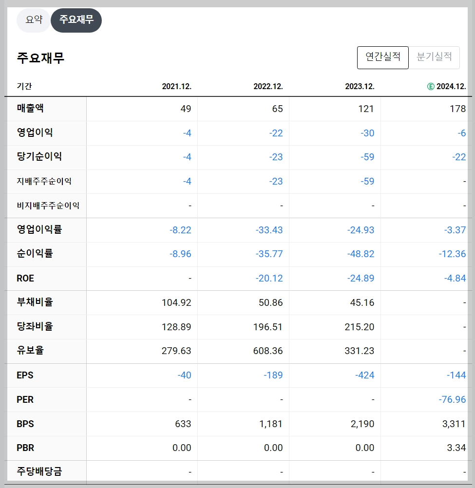 루미르의 재무 지표를 살펴보면 2024년 예상 매출액은 178억 원으로 전년 대비 크게 증가할 것으로 보입니다. 그러나 영업이익률은 -3.37%로 여전히 적자를 기록하고 있으며 순이익률도 -12.36%로 부진한 상태입니다. 부채비율은 안정적인 수준인 45.16%를 유지하고 있으며 당좌비율은 높은 수준(215%)으로 유동성 위험은 낮습니다.