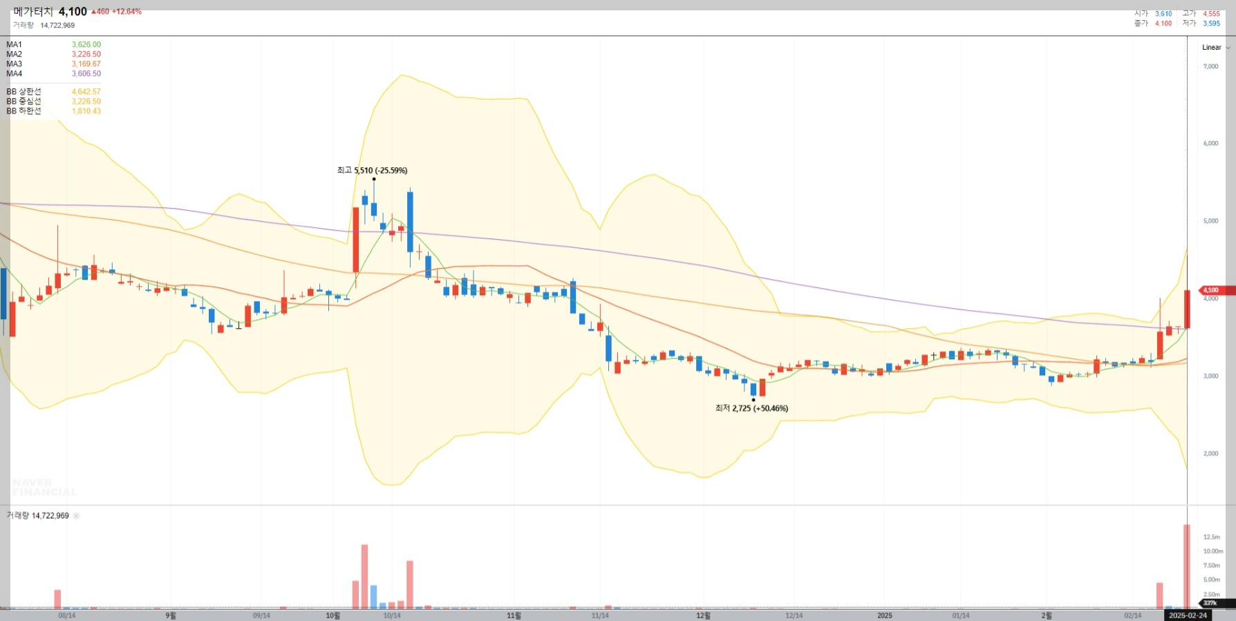 2025년 2월 24일 기준 메가터치의 종가는 4,100원으로 전일 대비 12.54% 상승했습니다. 최근 거래량이 급증하며 단기적인 변동성이 커지고 있는 모습입니다.