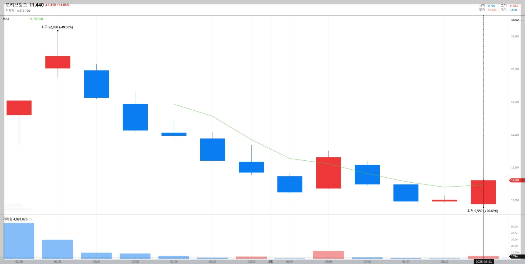 2025년 2월 20일 코스닥에 상장한 모티브링크는 공모가 대비 약 193% 상승한 17,610원으로 첫 거래를 마쳤습니다. 이후 고점 대비 약 50% 하락했지만, 단기 반등 가능성이 언급되고 있습니다.