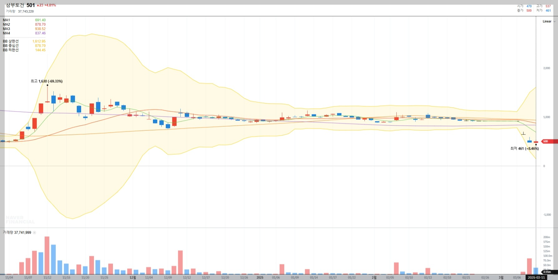 2025년 3월 11일 기준 삼부토건의 주가는 501원으로 기록되었습니다. 이는 최근 급락세를 반영하며, 단기적인 기술적 반등 가능성이 있으나 불확실성이 큽니다.