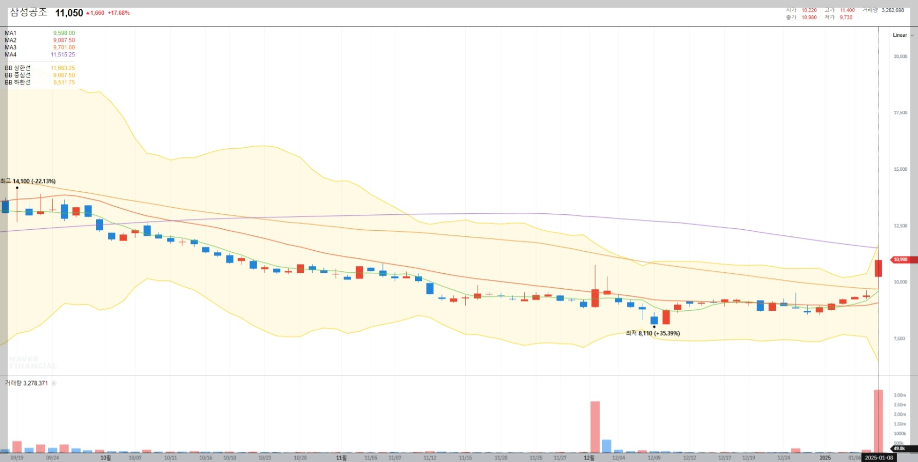 볼린저밴드는 삼성공조의 단기적 매수·매도 시점을 판단하는 데 유용한 지표입니다. 현재 삼성공조는 볼린저밴드 중심선을 상회하며 상단선에 근접한 상태로 단기 과매수 구간에 진입할 가능성이 있습니다. 따라서 추가 상승 여력이 있지만 조정 가능성도 염두에 둬야 합니다.