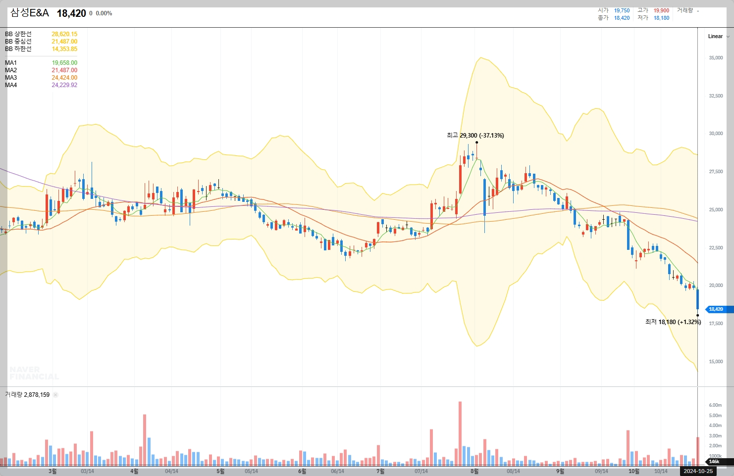 2024년 10월 28일 기준, 삼성 E&A의 주가는 18.420원입니다. 최근 몇 년간 주가는 변동성을 보였지만, 대체로 상승 추세를 유지하고 있습니다. 이는 회사의 실적 개선과 미래 성장 가능성에 대한 시장의 긍정적인 평가를 반영합니다.