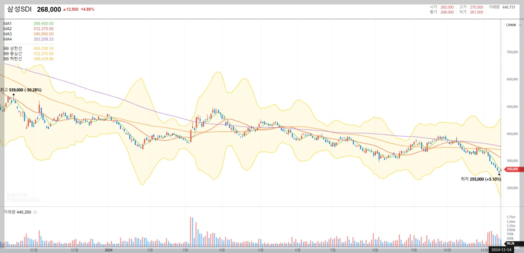 2024년 11월 14일 기준, 삼성SDI의 주가는 268,000원으로 마감되었습니다. 이는 최근 몇 달간의 하락세를 반영한 것으로, 최고점인 539,000원 대비 약 50% 하락한 상태입니다. 하지만 최근 반등 조짐이 나타나며 투자자들의 관심이 다시 집중되고 있습니다.