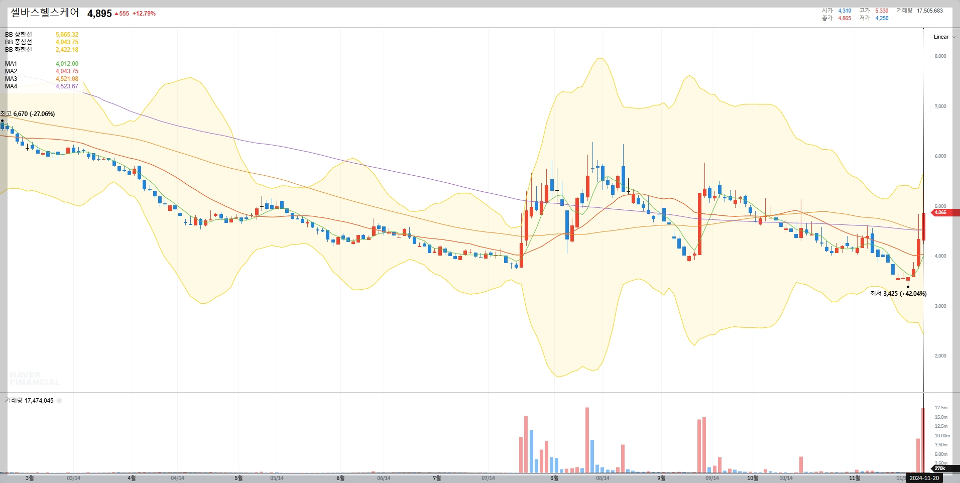 현재 셀바스헬스케어의 주 4,895원입니다. 최근 급등세를 보였으나 변동성이 큰 양상을 보이고 있습니다. 이러한 변동은 AI 관련 사업에 기대와 더불 시장에서 불확실성이 반영된 것으로 판단됩니다.