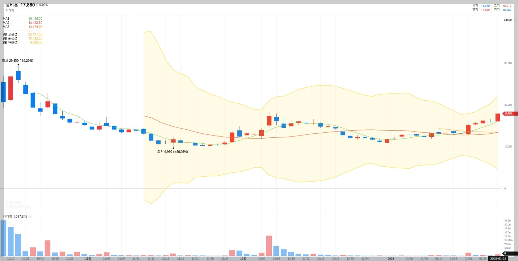 2025년 1월 22일 기준으로 셀비온의 종가는 17,880원입니다. 최근 몇 달간의 차트를 보면, 주가는 하락세에서 점차 안정화되는 모습을 보이고 있습니다.