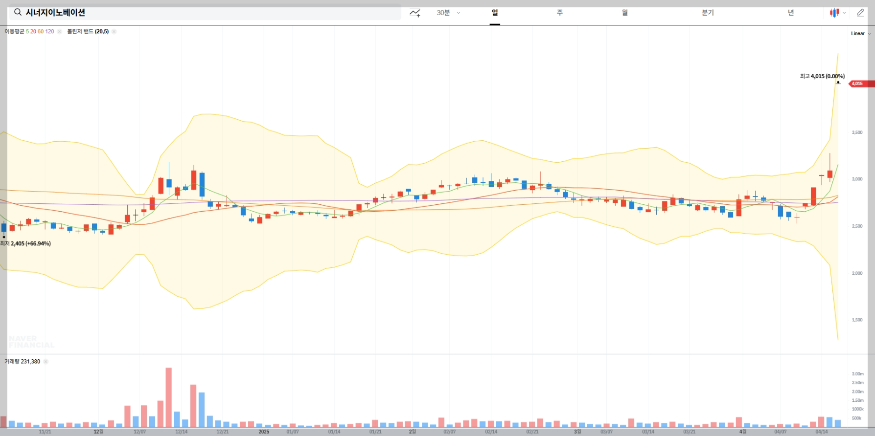 최근 시너지이노베이션은 강한 거래량과 함께 상한선 돌파가 빈번히 나타나, 단기 과열 신호와 함께 추가 상승 모멘텀도 존재함을 시사합니다.