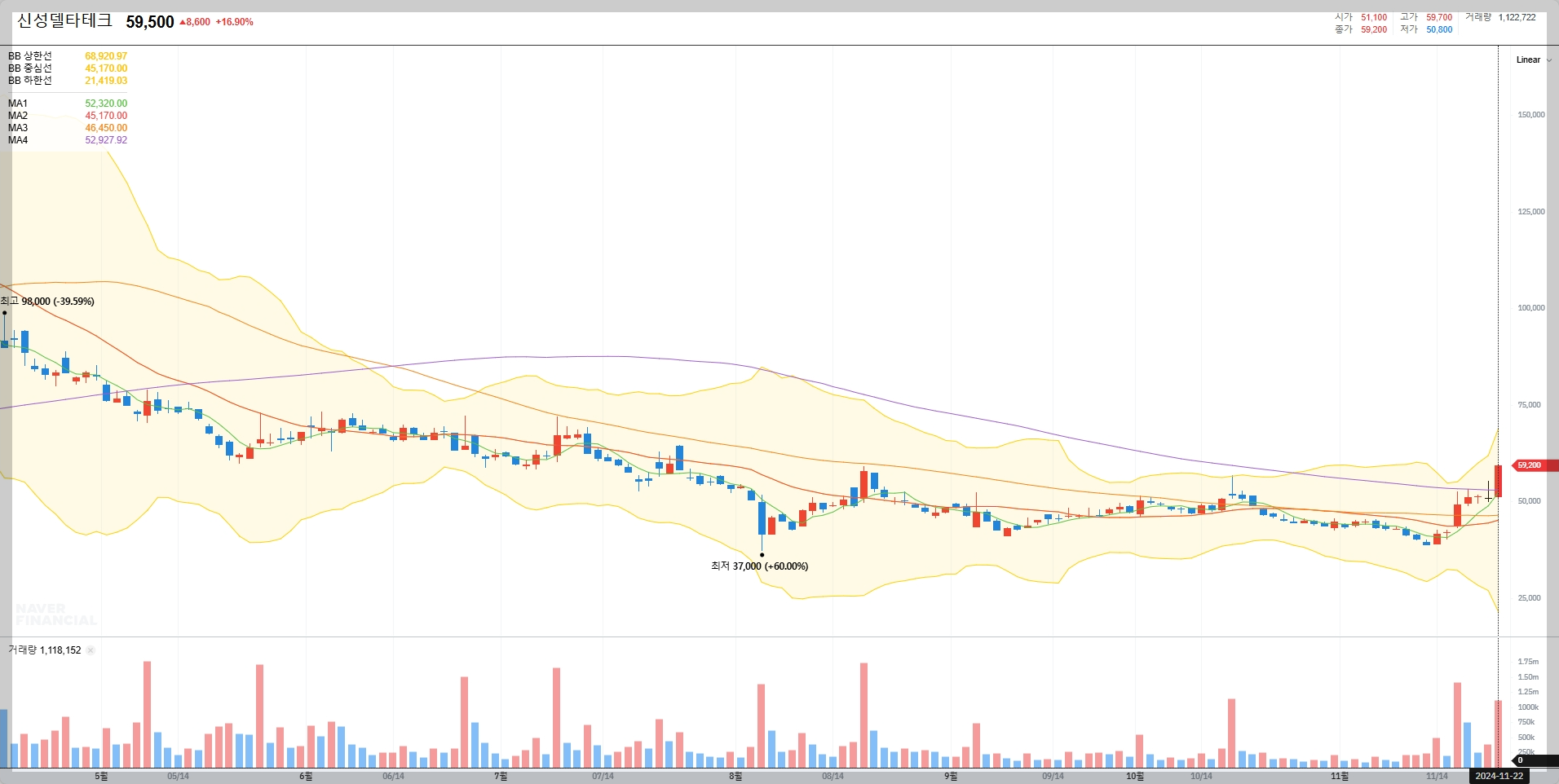 2024년 11월 22일 기준 신성델타테크의 종가는 59,500원으로 전일 대비 16.9% 상승했습니다. 이는 최근 투자 심리가 개선되며 거래량이 급증한 결과로 보입니다.