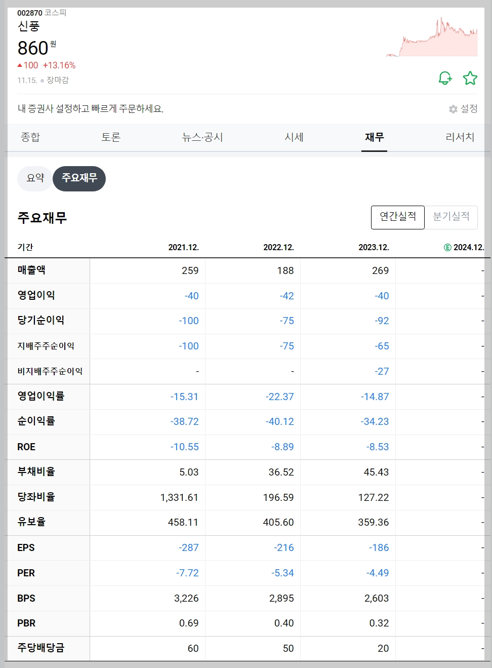 2024년 11월 15일 기준, 신풍의 주가는 860원으로 마감되었습니다. 이는 전일 대비 13.16% 상승한 수치로, 최근 하락세에서 반등하는 모습을 보였습니다. 그러나 여전히 과거 최고점 대비 약 52% 하락한 상태입니다.