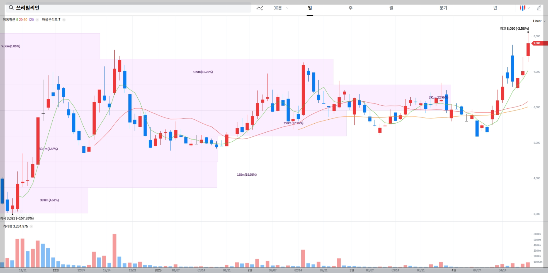• 2025년 4월 21일 기준, 쓰리빌리언 주가는 7,940원으로 전일 대비 13.27% 상승.