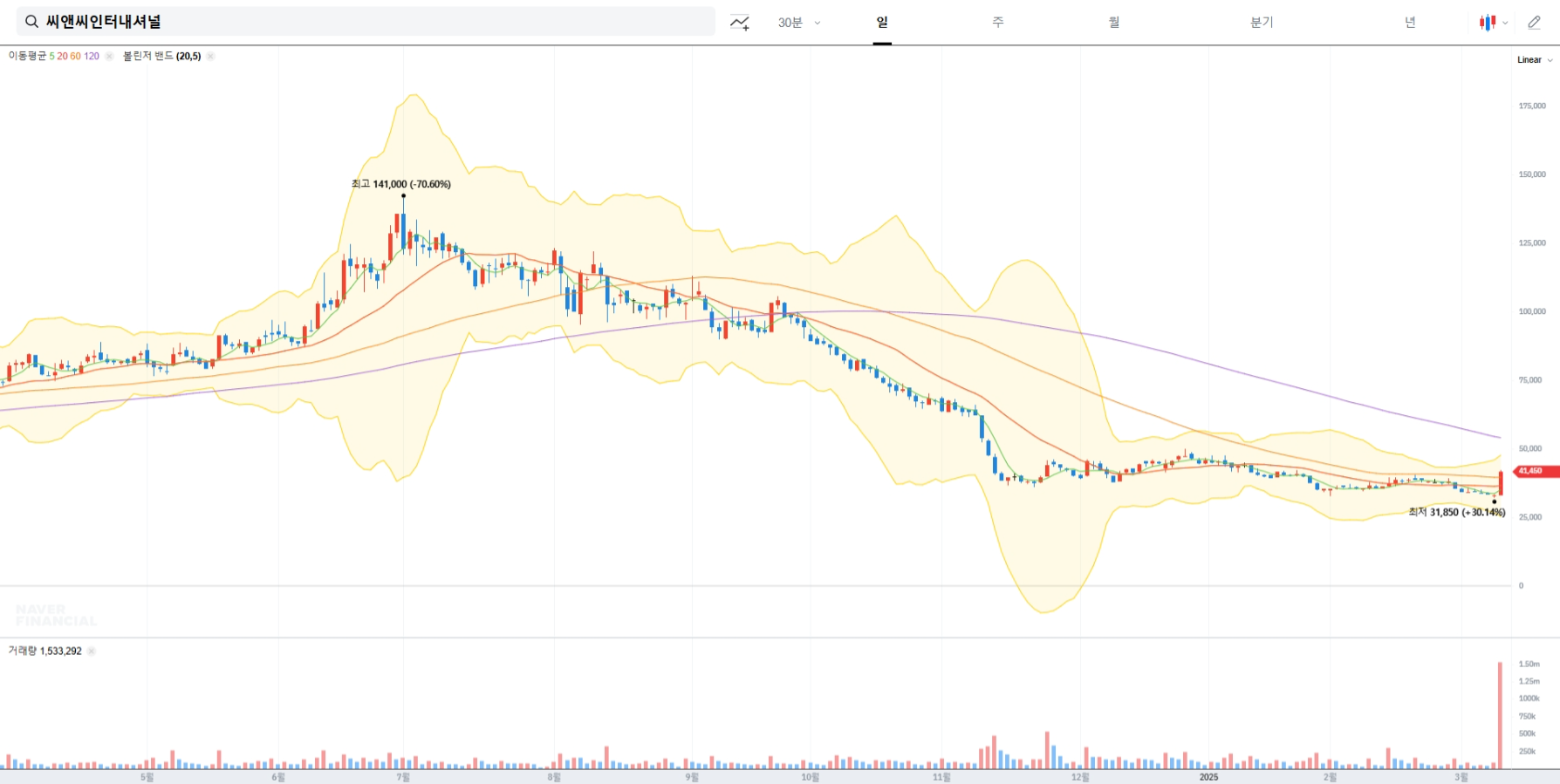 2025년 3월 12일 기준 씨앤씨인터내셔널의 주가는 41,450원으로 전일 대비 26.18% 상승했습니다. 이는 외국인의 적극적인 매수와 함께 실적 개선 기대감이 반영된 결과로 분석됩니다.