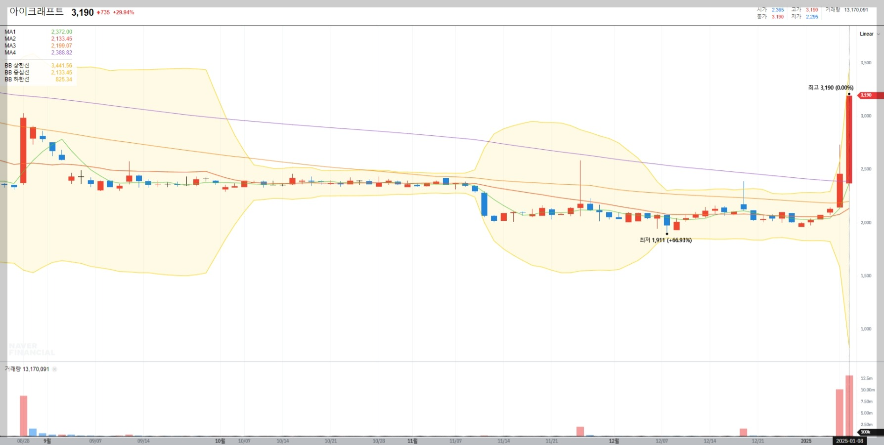 아이크래프트의 현재 주가는 3,190원으로 전일 대비 약 29.94% 상승했습니다. 이는 최근 거래량 증가와 더불어 투자 심리가 크게 개선된 결과로 보입니다.