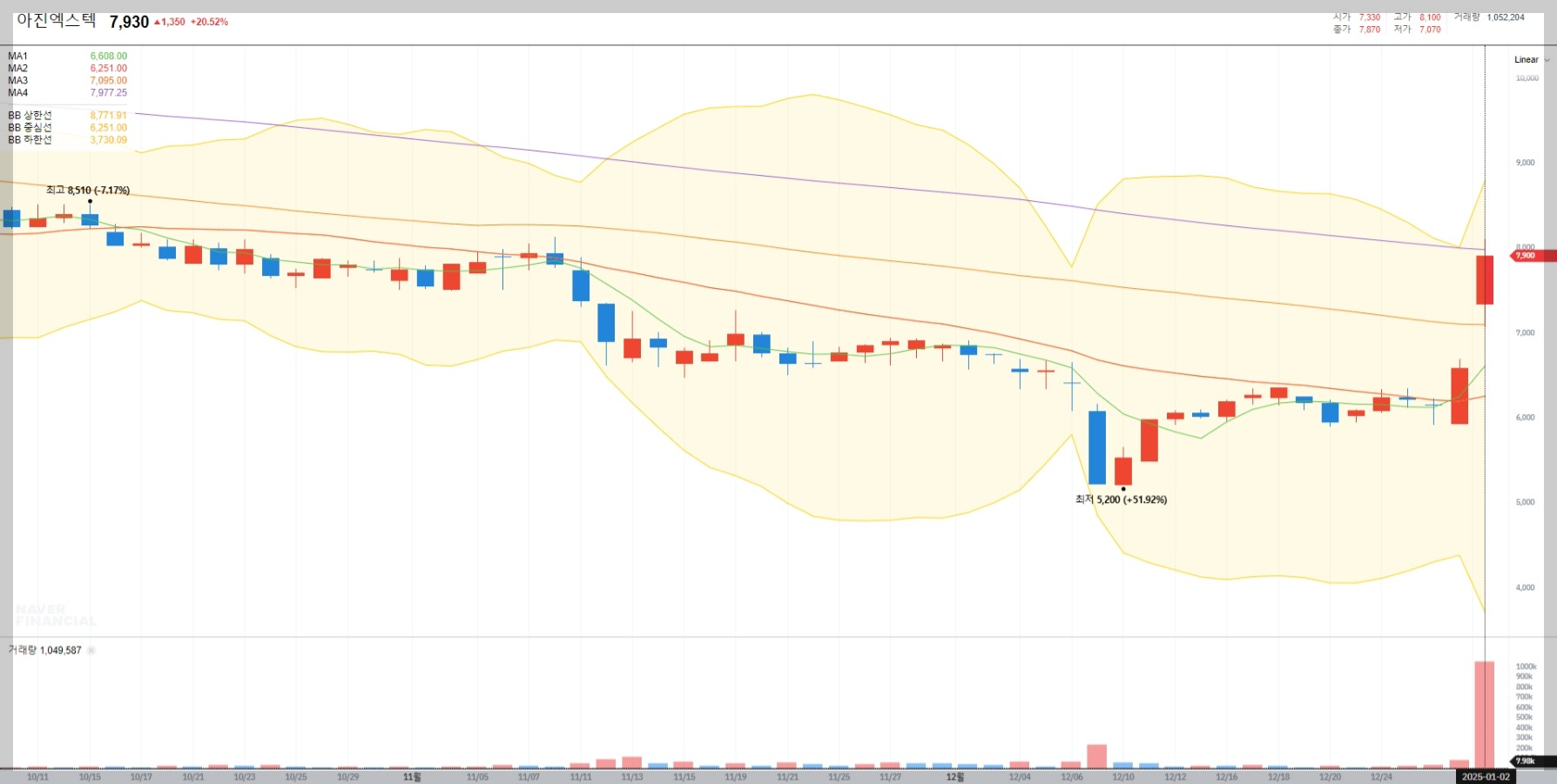 2025년 1월 2일 기준 아진엑스텍의 주가는 7,930원으로 전일 대비 20.52% 상승했습니다. 이는 삼성전자 관련 모멘텀과 기술적 분석에서의 저항선 돌파로 해석됩니다.