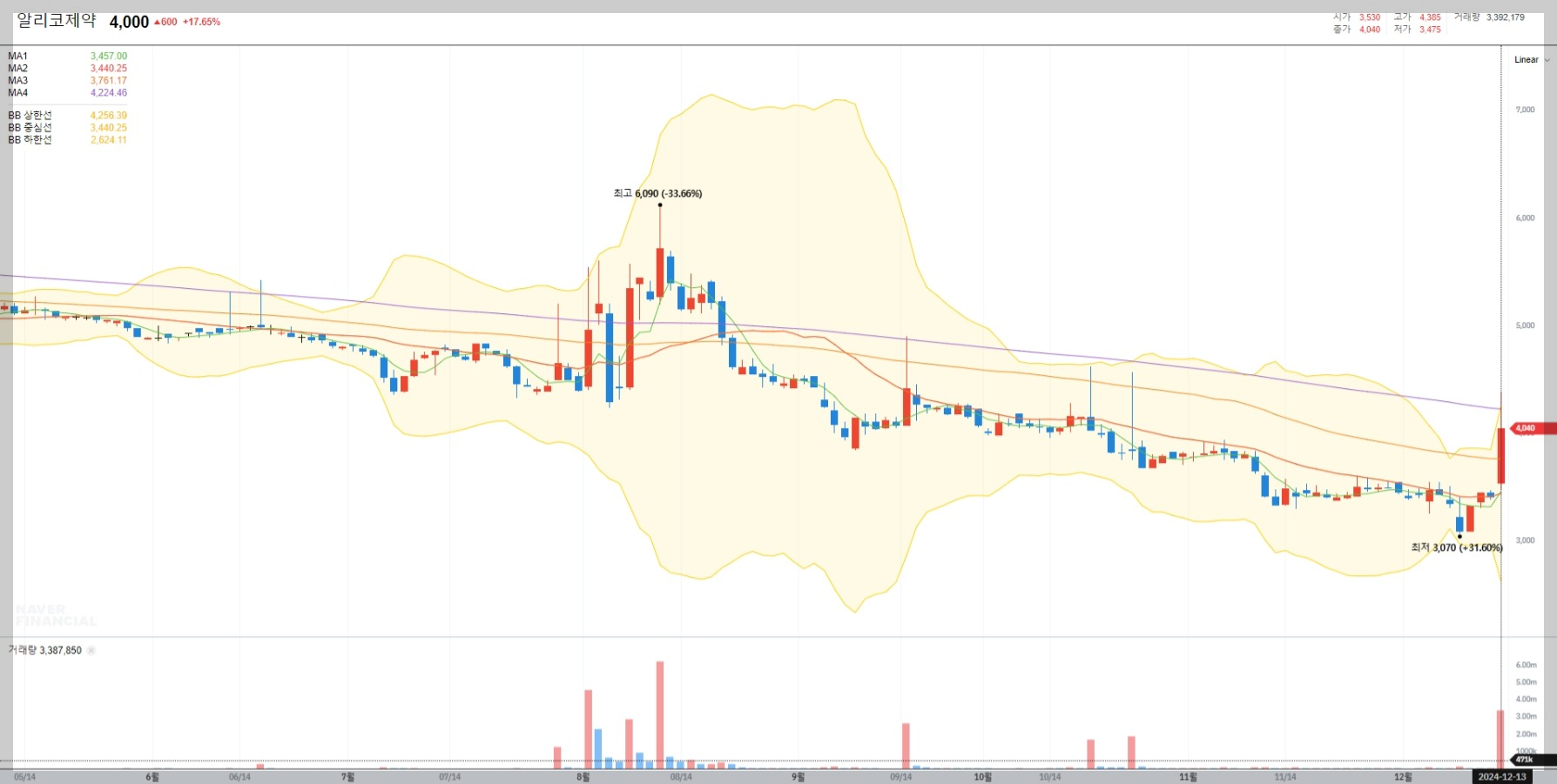 2024년 12월 13일 현재 알리코제약의 종가는 4,000원으로 전일 대비 17.65% 상승했습니다. 최근 저점인 3,070원에서 반등하며 단기적으로 강한 상승세를 보이고 있습니다.