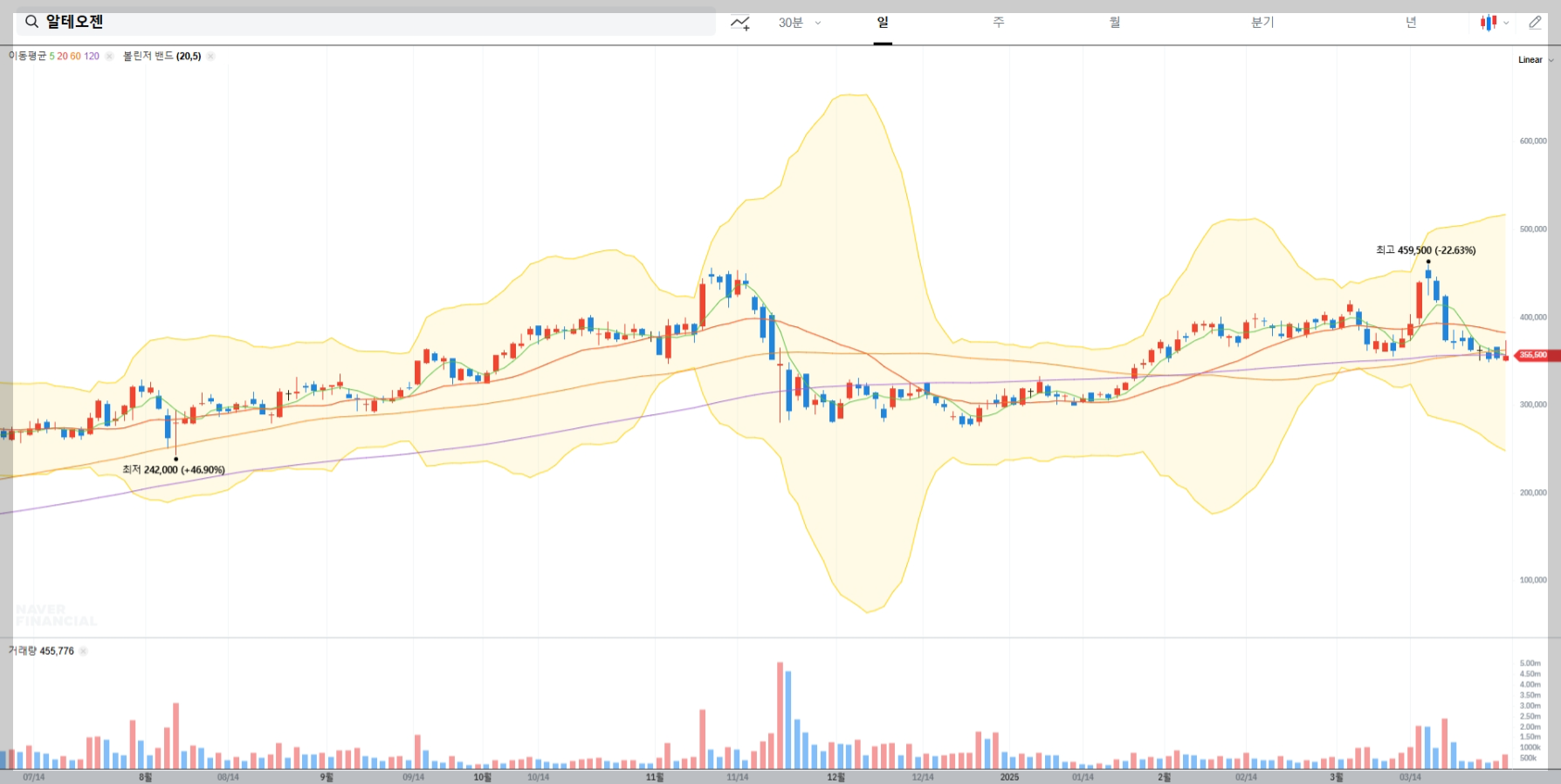 알테오젠의 현재 주가는 356,000원으로, 전일 대비 3,500원(+0.99%) 상승했습니다. 2025년 3월 31일 기준으로 꾸준한 상승세를 보이고 있으며, 바이오 섹터 내에서도 강세를 보이는 종목 중 하나입니다.
