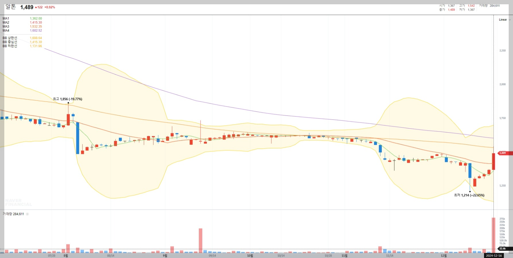 2024년 12월 16일 기준 알톤의 주가는 1,489원으로 전일 대비 8.92% 상승했습니다. 최근 하락세를 보이다가 반등하는 모습을 보여주고 있으며, 거래량도 증가세를 보이고 있습니다.