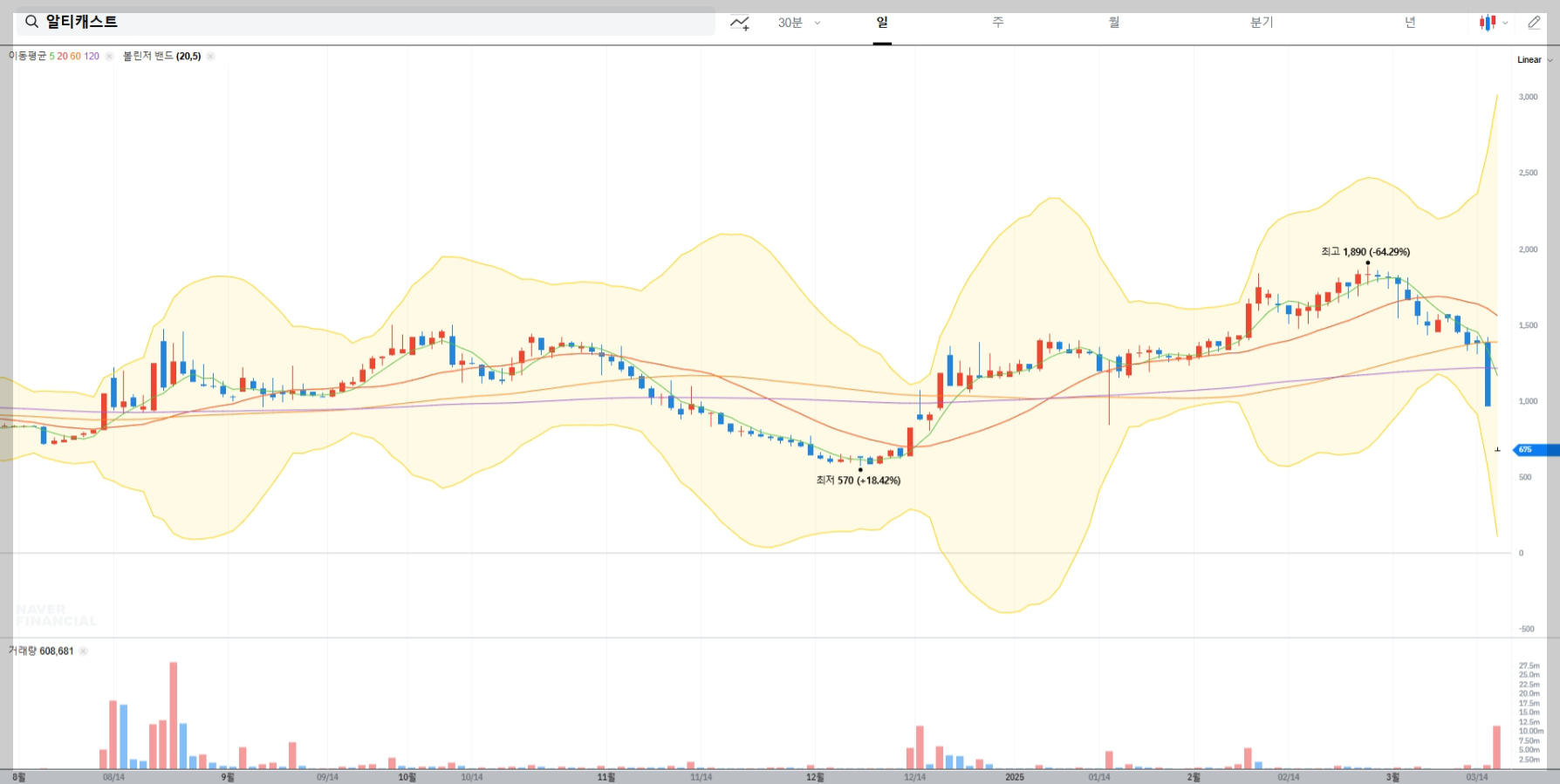 2025년 3월 18일 기준 알티캐스트의 현재 주가는 675원으로 전일 대비 29.98% 하락했습니다. 이는 최근의 급격한 변동성을 반영하며 투자자들에게 신중한 접근을 요구합니다.
