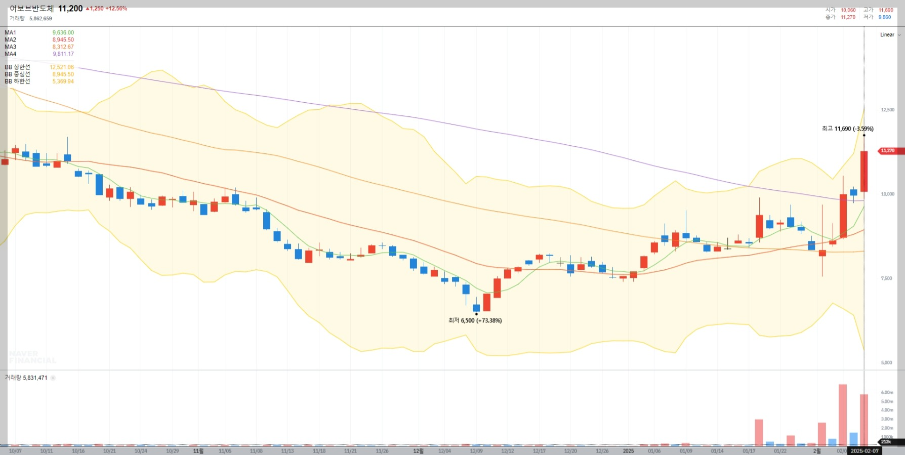 2025년 2월 7일 기준 어보브반도체의 현재 주가는 11,200원으로 전일 대비 12.56% 상승했습니다. 최근 거래량 증가와 함께 기술적 지표에서 긍정적인 신호가 나타나고 있어 단기적으로 추가 상승 가능성이 점쳐지고 있습니다.