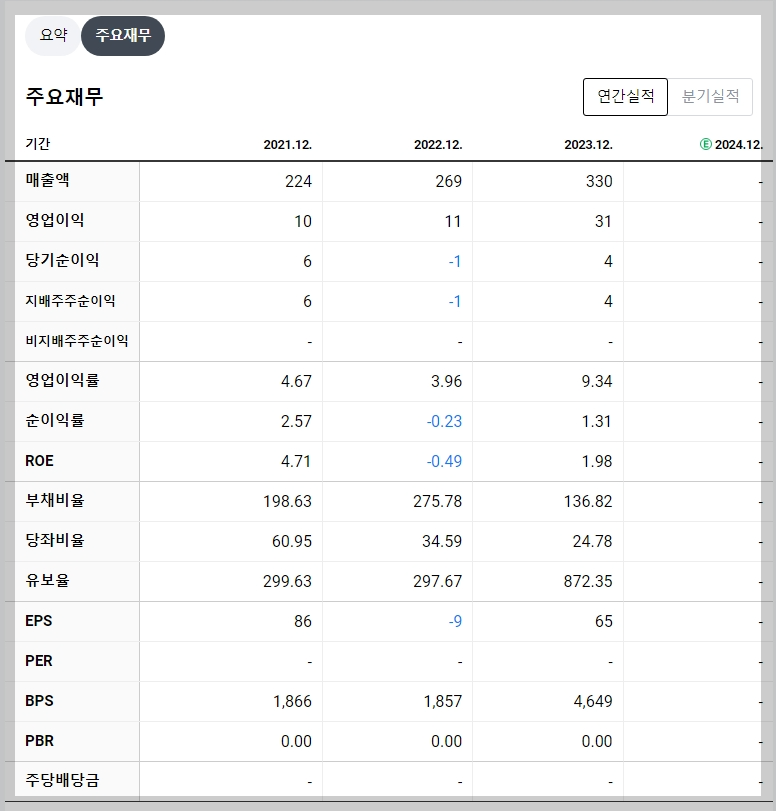 에르코스는 화학 산업 분야에서 활동하는 기업으로, 최근 몇 년간 꾸준히 매출 성장을 보여주었습니다. 2023년 기준 매출액은 330억 원으로 전년 대비 증가했으며, 영업이익률도 9.34%로 상승했습니다. 그러나 순이익률은 1.31%로 다소 낮은 수준입니다.