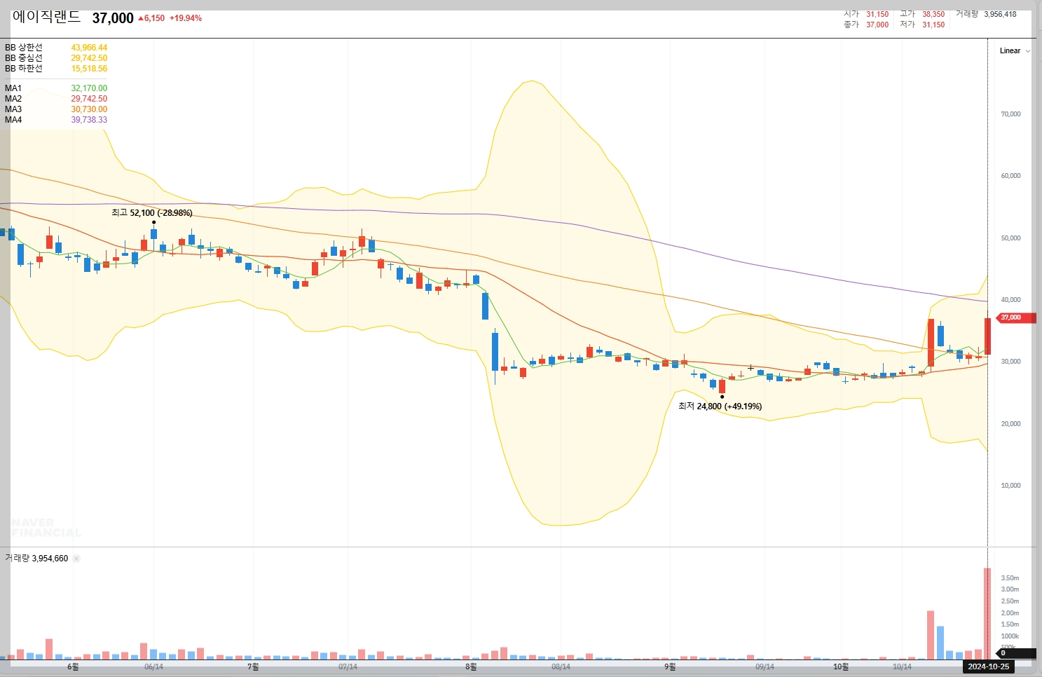 2024년 10월 24일 기준, 에이직랜드의 주가는 37,000원으로 전일 대비 19.94% 상승했습니다. 52주 최고가는 84,500원, 최저가는 24,800원입니다.