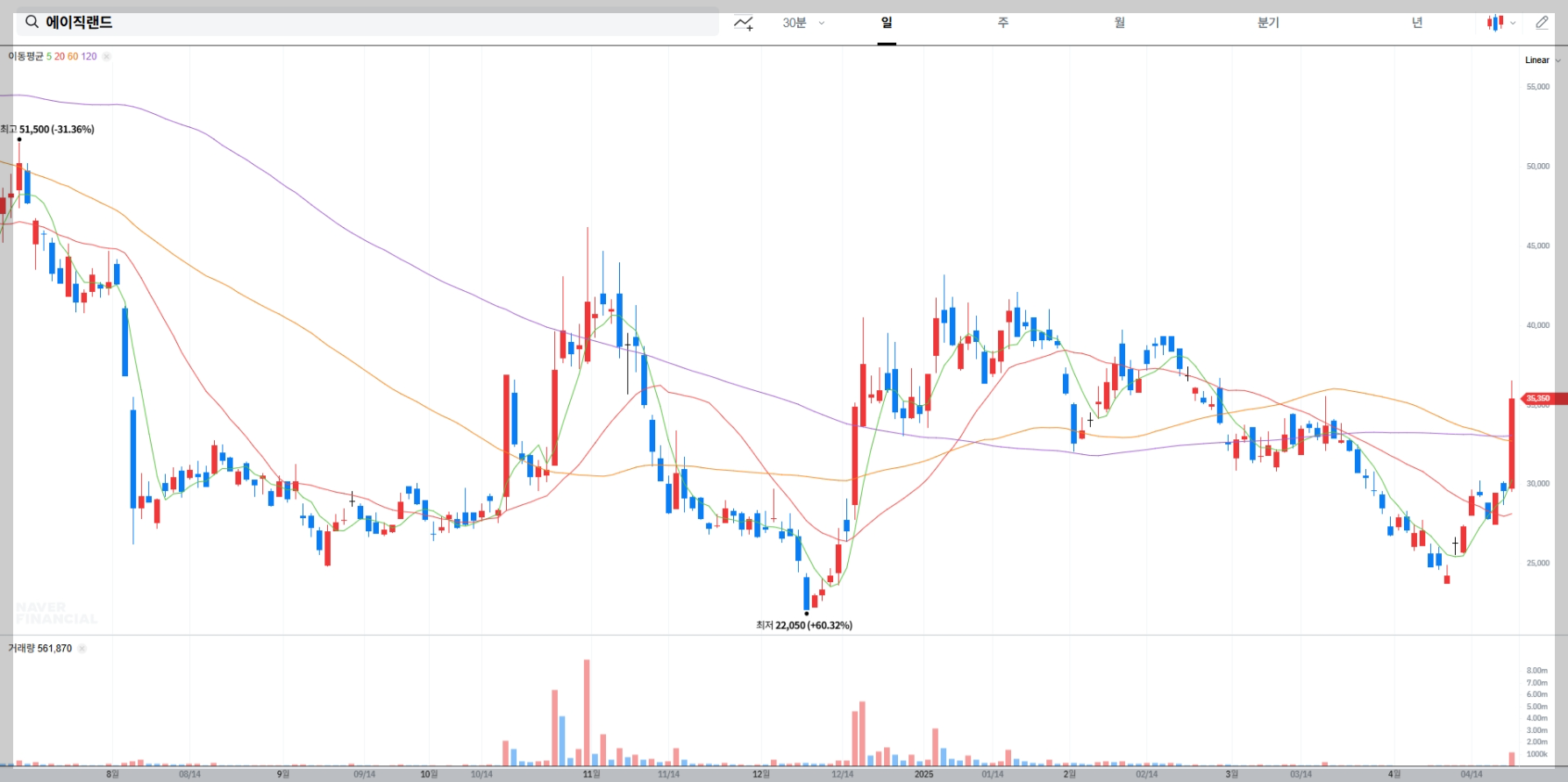 2025년 4월 21일 기준, 에이직랜드의 주가는 35,800원(+21.15%)으로 급등하며 시장의 주목을 받고 있습니다