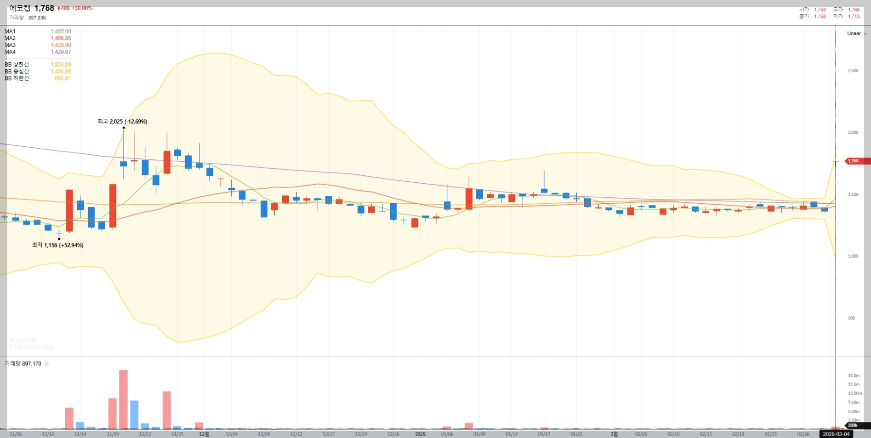 볼린저밴드 분석 결과 에코캡의 현재 주가는 평균선(1,607원)을 상회하며 상단 밴드(2,141원)에 근접하고 있습니다. 이는 단기적으로 과매수 상태를 나타낼 수 있으므로 신중한 접근이 필요합니다.