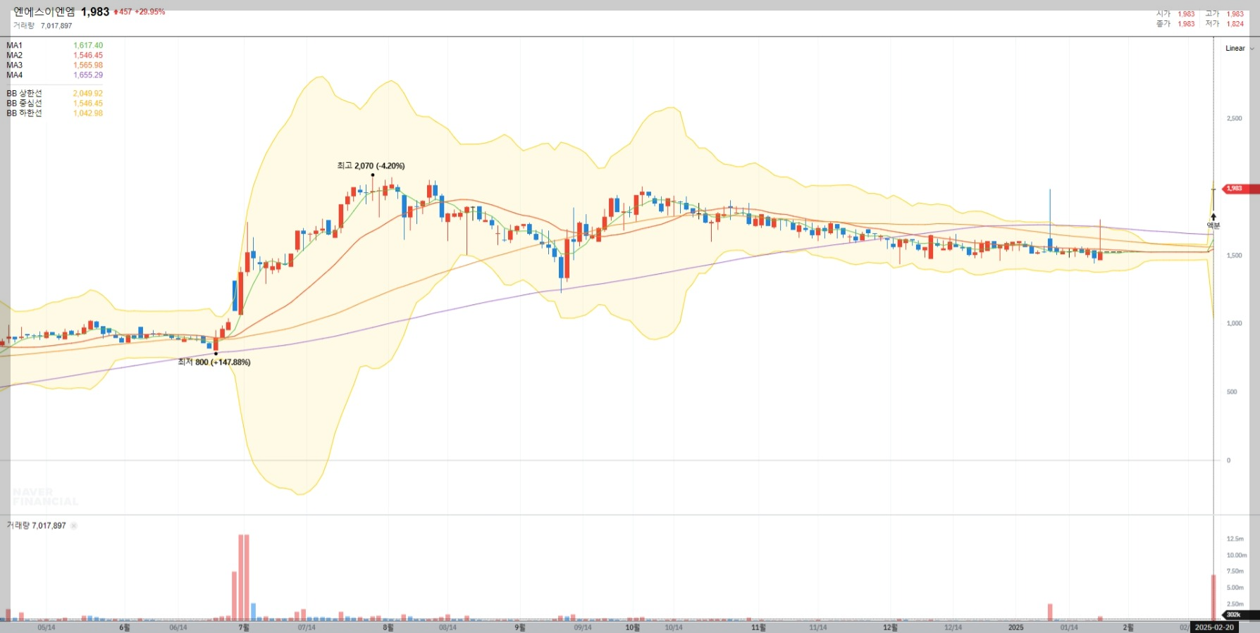 2025년 2월 20일 기준, 엔에스이엔엠의 주가는 1,983원으로 전일 대비 29.95% 상승했습니다. 이는 거래량 증가와 함께 투자자들의 강한 매수세를 반영한 결과로 보입니다.