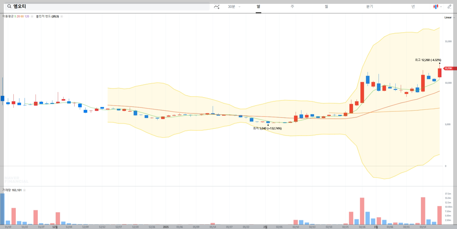 2025년 3월 19일 기준 엠오티의 현재가는 11,910원으로 전일 대비 16.76% 상승했습니다. 최근 거래량 증가와 함께 단기적인 상승세를 보이며 투자 심리가 긍정적으로 변화하고 있습니다.
