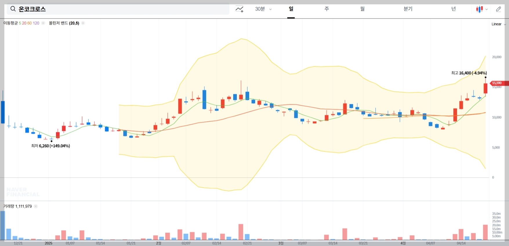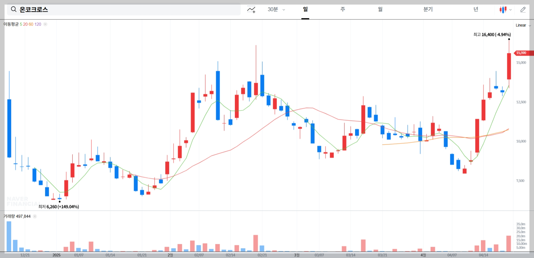 온코크로스의 주가는 2025년 4월 18일 기준 15,590원으로, 전일 대비 2,480원(18.92%) 상승했습니다. 이러한 상승세의 주요 원인을 살펴보겠습니다.