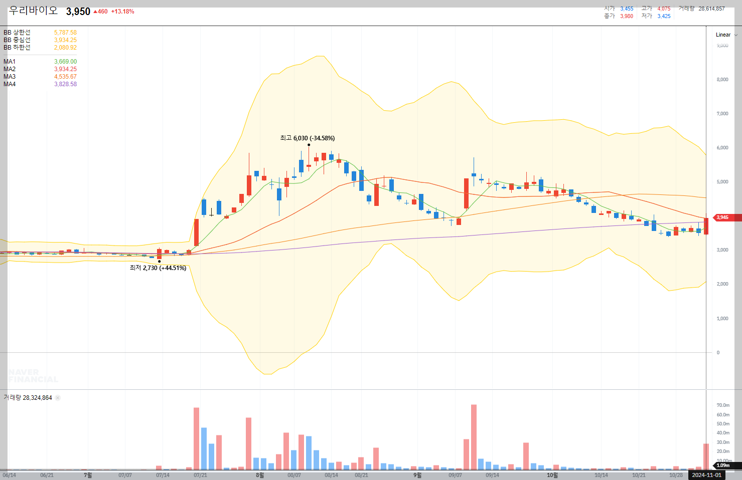 2024년 11월 1일 현재, 우리바이오의 주가는 3,950원으로, 전일 대비 13.18% 상승한 것으로 나타났습니다.