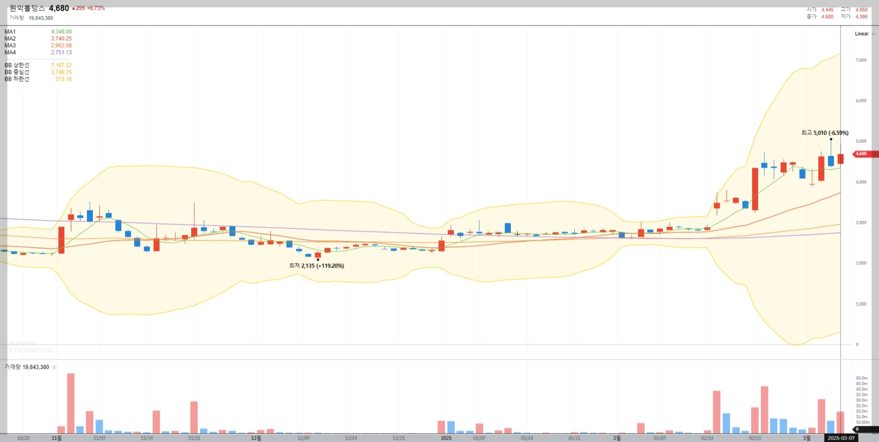 2025년 3월 7일 기준 원익홀딩스의 현재 주가는 4,680원으로 전날 대비 6.73% 상승했습니다. 최근 몇 달간의 차트를 보면, 저점인 2,135원에서 현재까지 약 119% 상승하며 강력한 상승세를 보이고 있습니다.