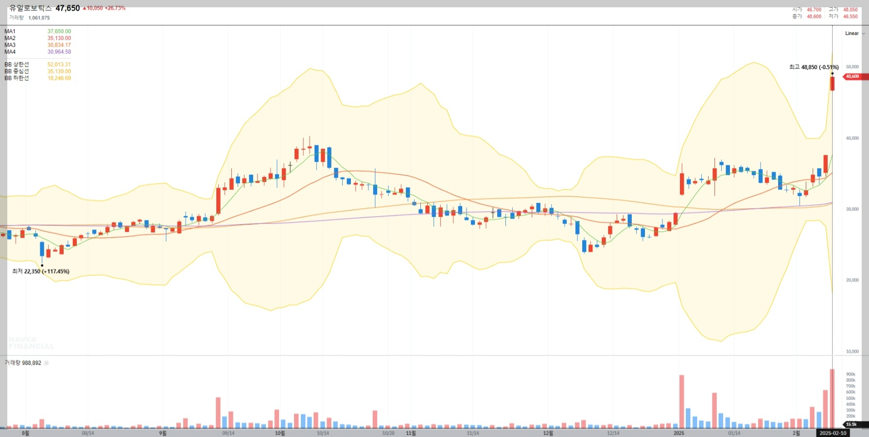 2025년 2월 10일 기준, 유일로보틱스의 현재 주가는 47,650원으로 전일 대비 26.73% 상승했습니다. 이는 최근 긍정적인 뉴스와 시장 기대감이 반영된 결과로 보입니다.