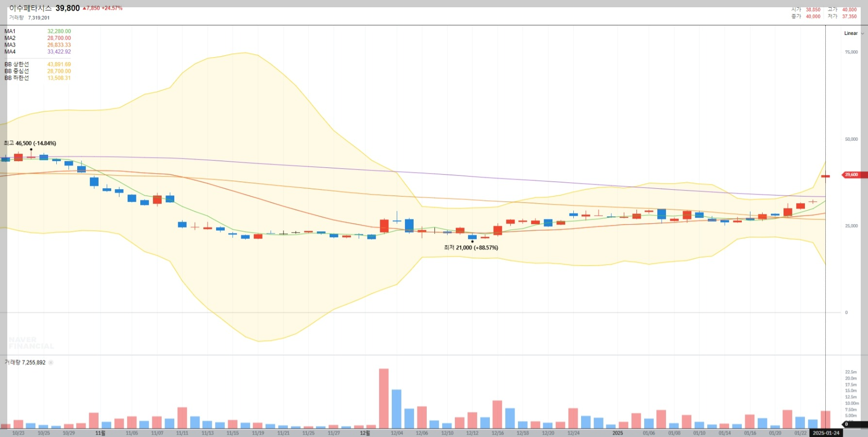 현재 이수페타시스의 주가는 39,800원으로 전일 대비 24.57% 상승했습니다. 이는 제이오 인수 철회 발표와 관련된 긍정적인 시장 반응과 AI 인프라 수요 증가에 따른 기대감 때문으로 분석됩니다.