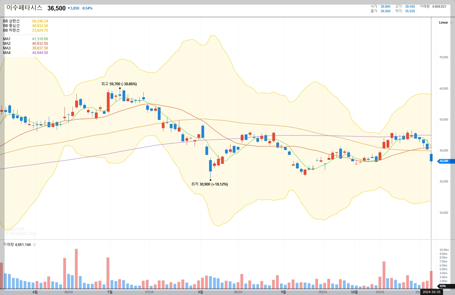 2024년 10월 31일 기준, 이수페타시스의 주가는 36,500원으로 전일 대비 9.54% 하락했습니다. 이러한 주가 변동은 반도체 시장의 변화와 관련이 있습니다.