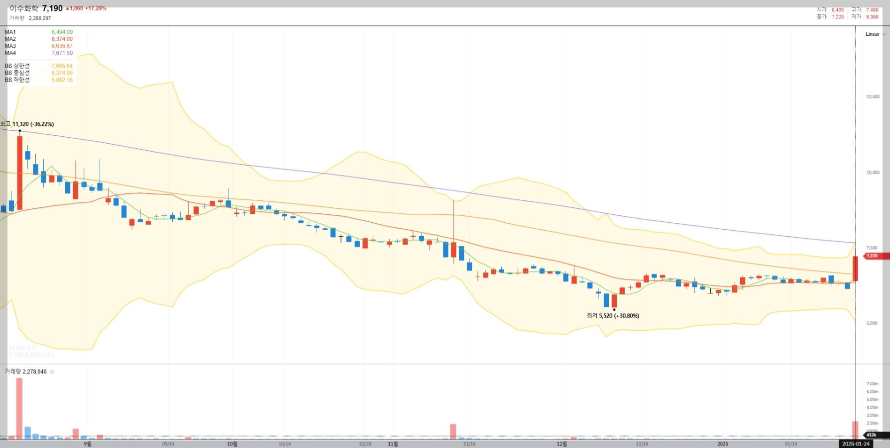 2025년 1월 24일 기준 이수화학의 주가는 7,190원으로 전일 대비 약 17% 상승했습니다. 이는 제이오 인수 철회 소식과 관련된 긍정적인 시장 반응 때문입니다.