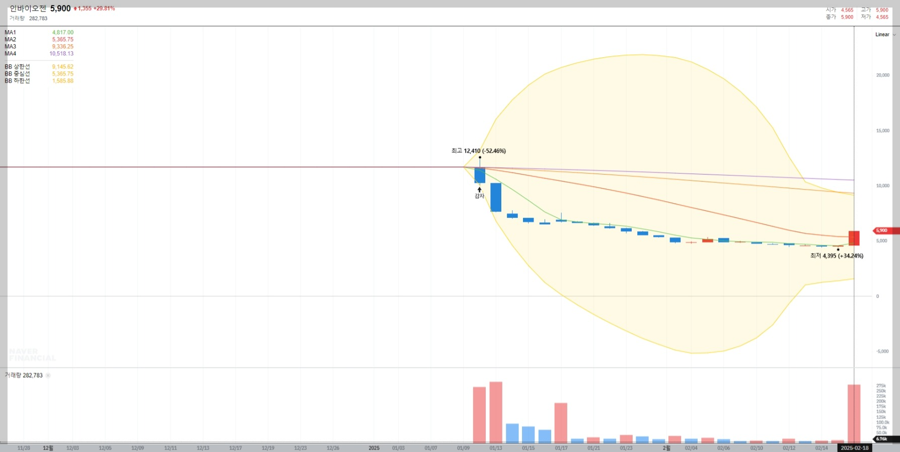 2025년 2월 18일 기준 인바이오젠의 주가는 5,900원으로 전일 대비 29.81% 상승하였습니다. 이는 단기적으로 과매도 상태에서 반등한 것으로 보이며, 거래량도 급증하여 투자자들의 관심이 집중되고 있습니다.