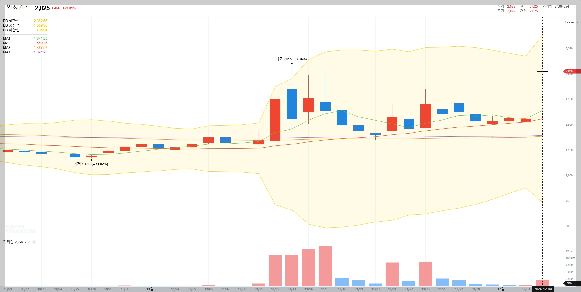 일성건설의 주가가 2,025원에 도달하여 상한가를 기록했습니다.