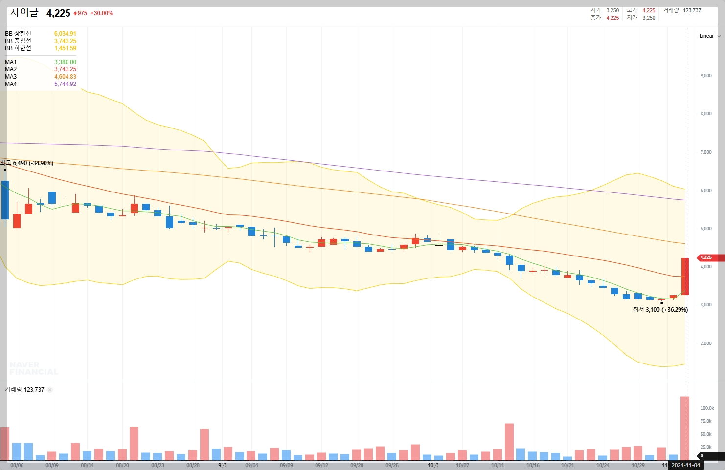 2024년 11월 4일 기준 자이글의 주가는 4,225원으로, 전일 대비 30% 상승하였습니다.